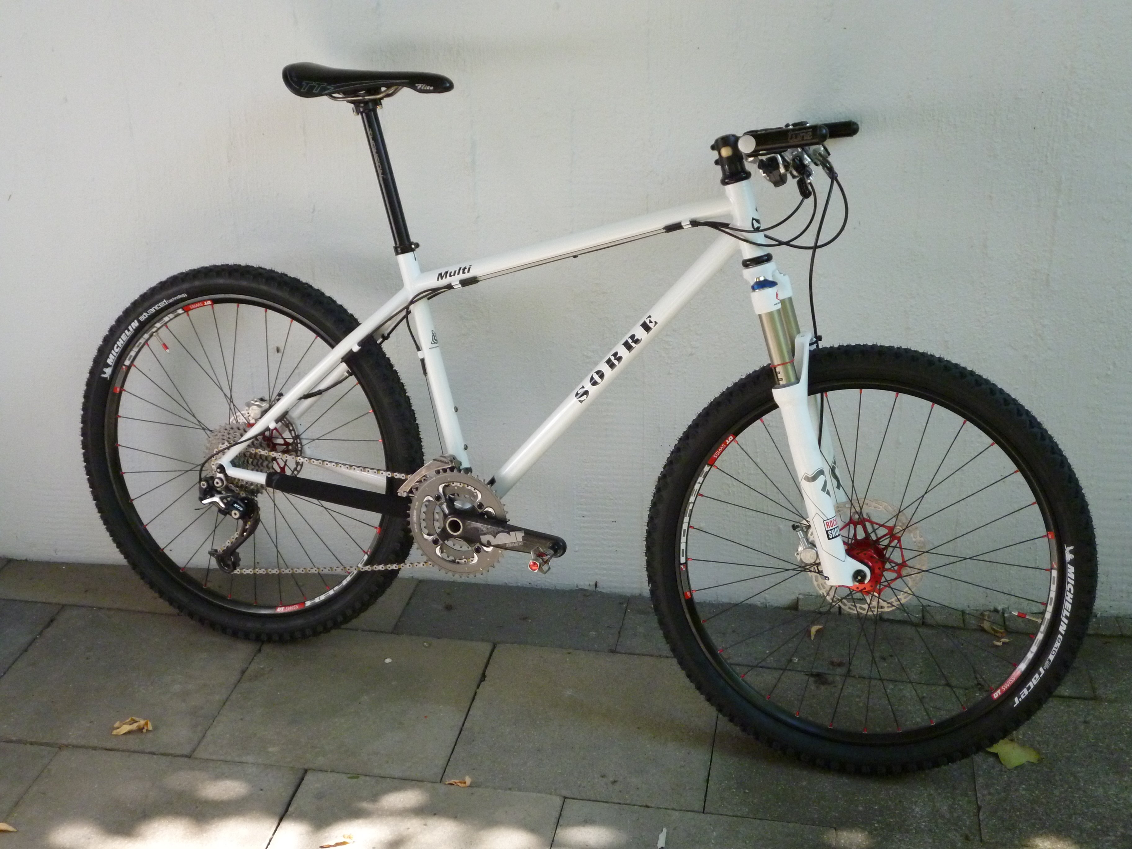 Sobre Multi Size M (46cm) Stahlrahmen, Gabel RS SID RLT 100mm, XTR Schaltung, XTR 11-34 Ritzelpaket, XTR Yumeya Kette, Truvativ Noir Carbonkurbel, Eggbeater SL Pedale, Laufräder Hope Pro II mit DTComp Speichen + DT XR400 Felge + Michelin Wildrace'R Reifen, Brakes Hope Tech X2 180/160mm, Vorbau Syntace F99 105mm, Syntace Duraflite Carbon Lenker, Thomson Stütze, Flite TT Sattel, Tune Hörnchen, Tune Schnellspanner, Chris King Steuersatz... 10,58 Kg.